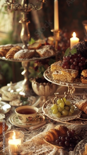 © Yana Buzhynska, Naklejka premium On a wooden table covered with woven lace there is a candle, aromatic coffee and a shelf with croissants, the best breakfast
