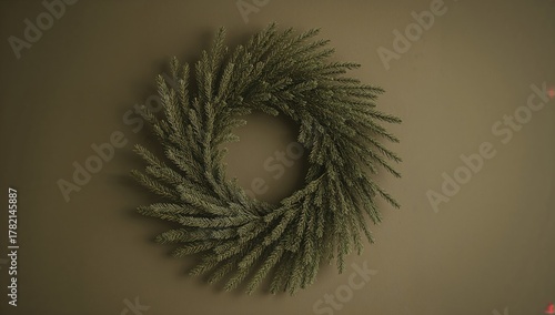 Naklejka premium On an olive colored wall, a circular wreath crafted from fir branches and...