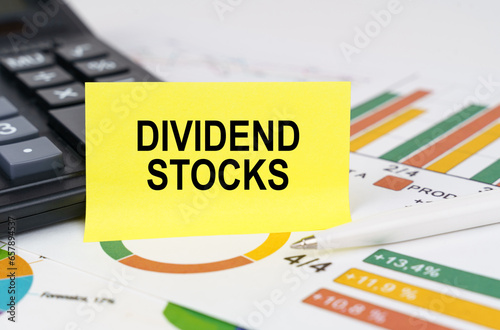 © Dzmitry, Naklejka premium On business reports there is a calculator and a sign with the inscription - Dividend stocks