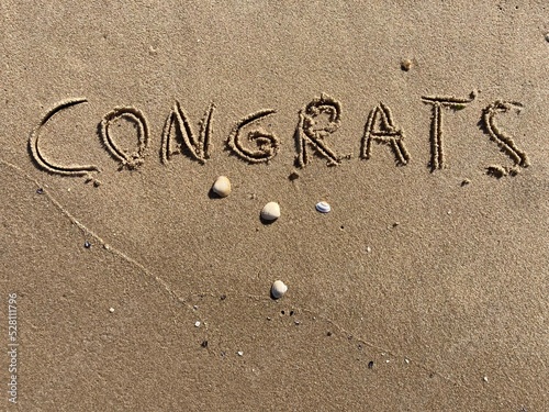 © Marcus, Fototapeta premium on the beach is carved with letters in the smooth sand the writing congrats