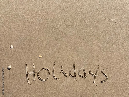© Marcus, Fototapeta premium on the beach is carved with letters in the smooth sand the writing holidays