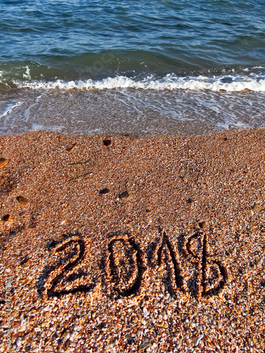 Fototapeta premium 2018 on the beach sand, sea wave is rolling. Sunny summer day. Textured...