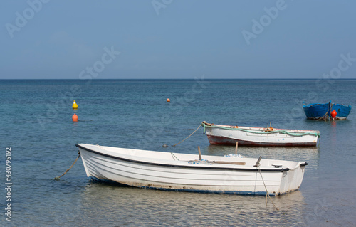 © leopictures, Naklejka premium On the coast of the Mediterranean there are three small, empty, old fishing boats under a blue sky