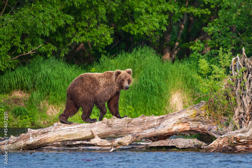 © Tatiana, Fototapeta premium On the lake, a Kamchatka bear is preparing for a sockeye salmon hunt.
