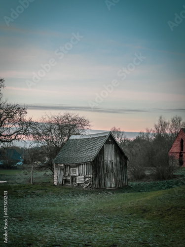 Fototapeta premium on the plot of land stands an ancient crooked wooden house