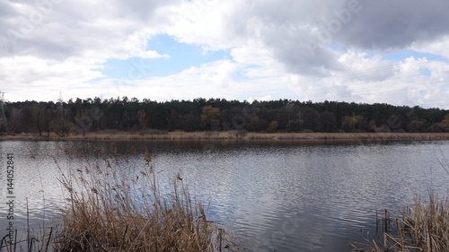 © olenka111, Fototapeta premium On the riverside grow tall dry grass. River view in cloudy weather.