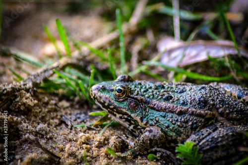 © Sv.Lana., Fototapeta premium On the sandy shore on the green grass sits a frog