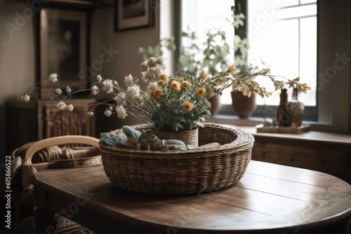 © Lasvu, Fototapeta premium On the table are some flowers in a rattan container. selective attention. Generative AI
