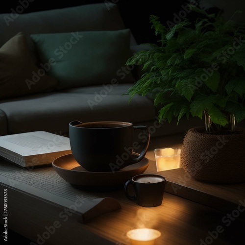 Obraz premium On the table in the room in the evening there is a burning lamp, a bouquet of...