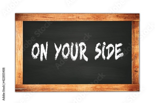 Fototapeta premium ON YOUR SIDE text written on wooden frame school blackboard.