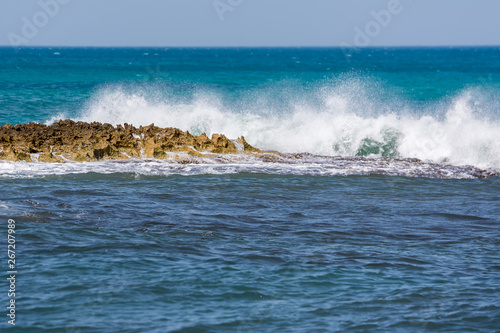 Fototapeta premium Onde spumeggianti che si infrangono sulla costa rocciosa e il mare blu