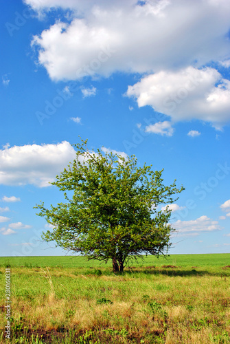 © ArtoPhotoDesigno, Fototapeta premium One apple tree on grass meadow, blue cloudy sunny sky