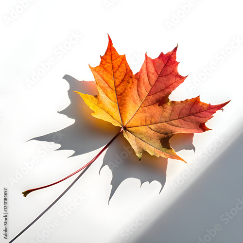 Fototapeta premium One autumn maple leaf with warm gradient colors and soft shadow on a white surface