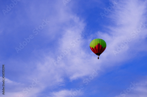 © Svetlana, Naklejka premium one balloon of red green in the pink blue sky flies away into the distance