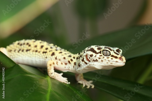 Naklejka premium One beautiful gecko on green leaf, closeup
