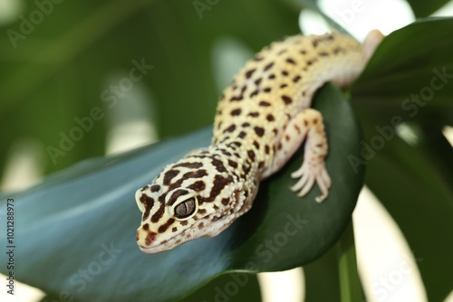 Naklejka premium One beautiful gecko on green leaf, closeup