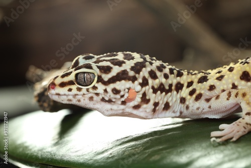 © New Africa, Fototapeta premium One beautiful gecko on green leaf, closeup