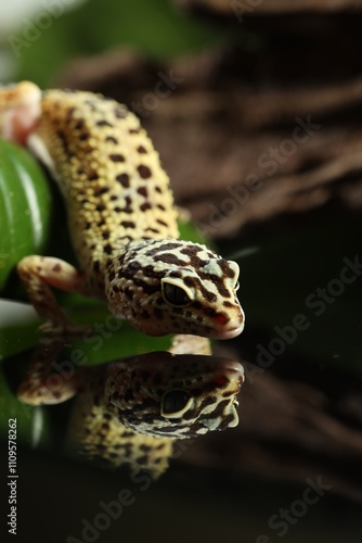 Naklejka premium One beautiful gecko on mirror surface, closeup