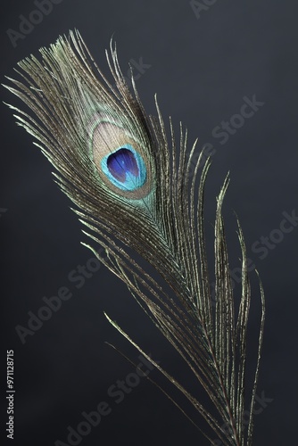 © New Africa, Obraz premium One beautiful peacock feather on black background, closeup