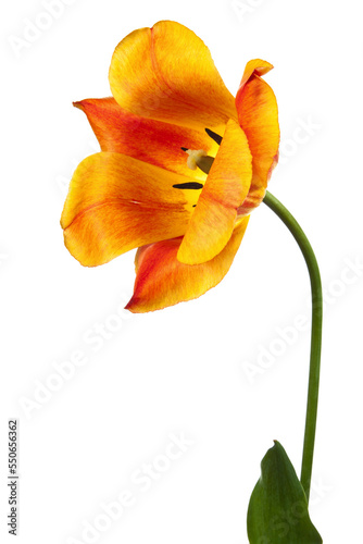 Naklejka premium One beautiful red-yellow tulip on a white background