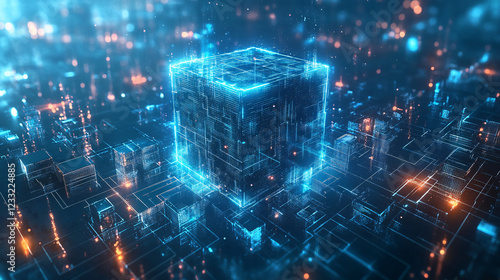 Fototapeta premium one big center tech cube linked with small cubes, technology, futurism, blue...