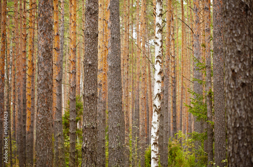 © pzAxe, Fototapeta premium One birch among pine forest - background
