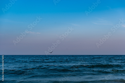 © Tom Ramsey, Obraz premium One Bird Flying Low Over Ocean