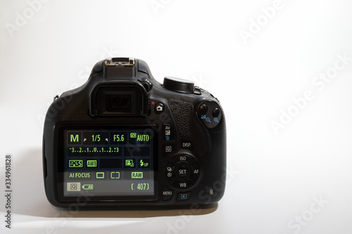 © Василий Комарницкий, Fototapeta premium One black camera isolated on white background. Back view