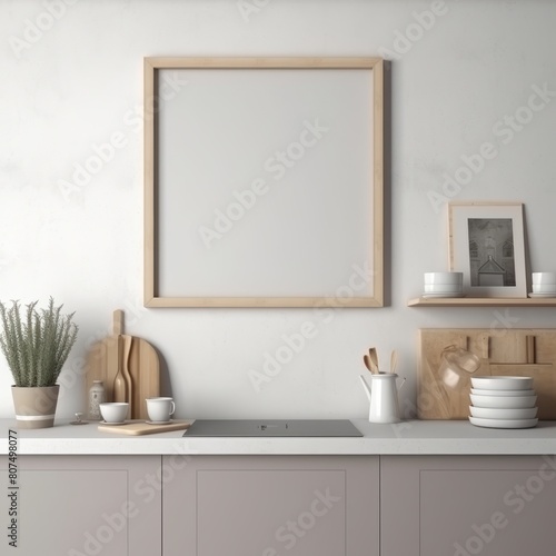 Fototapeta premium One blank white frame in a symmetrical kitchen 3d mock up, grey colours