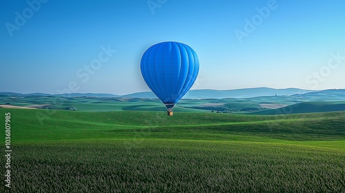 © Vladimir, Fototapeta premium One blue balloon floats gently above a green field under a clear sky