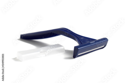 © DENIS , Obraz premium One blue men's razor lies on a white background.