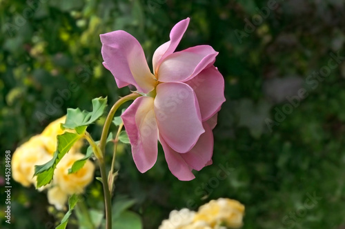 © fedotovalora, Fototapeta premium One bright beautiful pink rose close-up against a background of green leaves in a flower garden