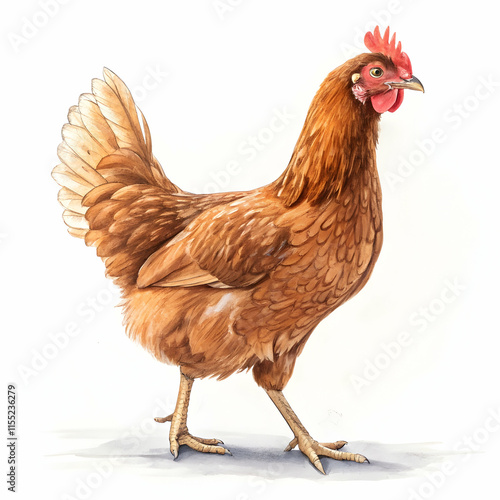 © Maria, Fototapeta premium One brown chicken standing in a row, on white background