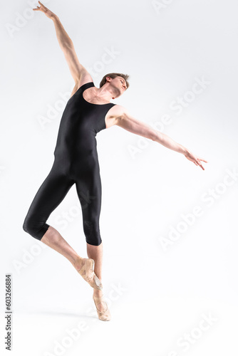 © danmorgan12, Obraz premium One Caucasian Ballet Dancer Young Athletic Man in Black Suit Posing in Stretching Pose Studio On White.