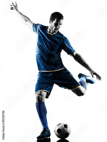 Fototapeta premium one caucasian soccer player man playing kicking in silhouette isolated on white background