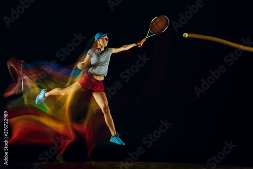Fototapeta premium One caucasian woman playing tennis isolated on black background in mixed and stobe light. Fit young female player in motion or action during sport game. Concept of movement, sport, healthy lifestyle.