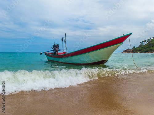 © Michaella, Fototapeta premium One colorful Thai Longtail boat with ribbons, anchored at a beach on a bright sunny day, with calm waters and bright blue skies and islands in the background. Shot on Ko Pha Ngan, Thailand.