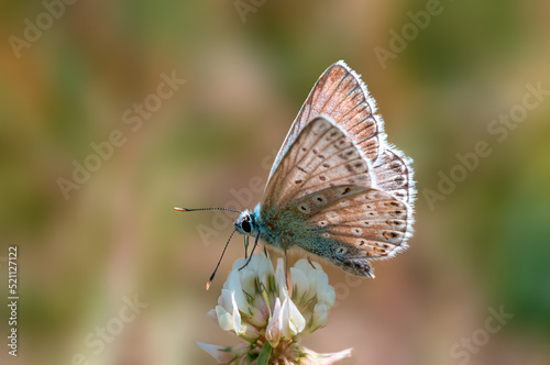 © Mario Plechaty, Obraz premium one common blue butterfly sits on a flower in a meadow