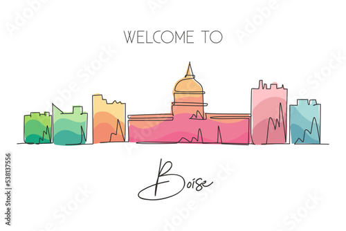 © Simple Line, Naklejka premium One continuous line drawing of Boise city skyline, Idaho. World beautiful landscape tourism and travel vacation for wall decor print. Stylish single line draw graphic design vector illustration