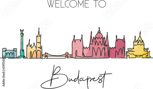 © Simple Line, Fototapeta premium One continuous line drawing of Budapest city skyline, Hungary. Beautiful landmark postcard. World landscape tourism travel vacation. Editable stylish stroke single line draw design vector illustration