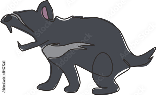 Obraz premium One continuous line drawing of fierce tasmanian devil for company logo identity. Carnivorous marsupial mascot concept for national zoo icon. Modern single line draw design vector graphic illustration