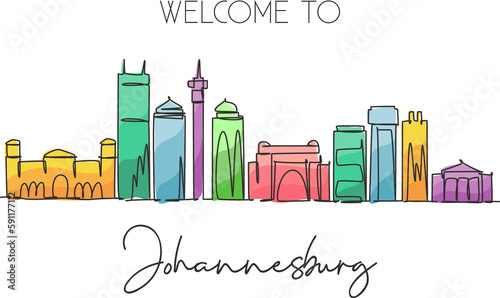 © Simple Line, Fototapeta premium One continuous line drawing of Johannesburg city skyline, South Africa. Beautiful landmark wall decor poster print. World landscape tourism travel. Stylish single line draw design vector illustration
