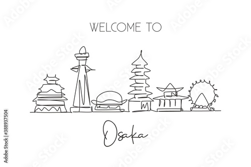 Fototapeta premium One continuous line drawing of Osaka city skyline, Japan. Beautiful landmark. World landscape tourism and travel vacation poster. Editable stylish stroke single line draw design vector illustration