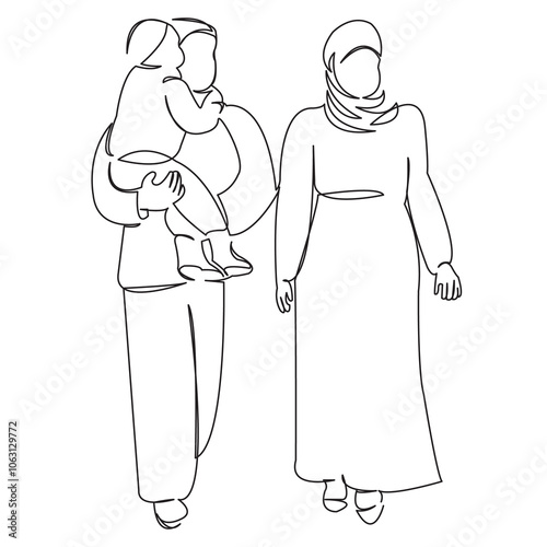 © nasharaga, Fototapeta premium One continuous single drawing line art flat doodle woman, muslim, family, people, child, islam, traditional. Isolated image hand draw contour on a white background