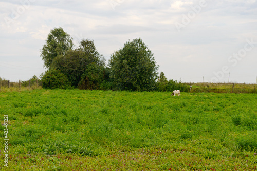 © alexnikit, Fototapeta premium one cow grazes on a glade on a summer cloudy evening