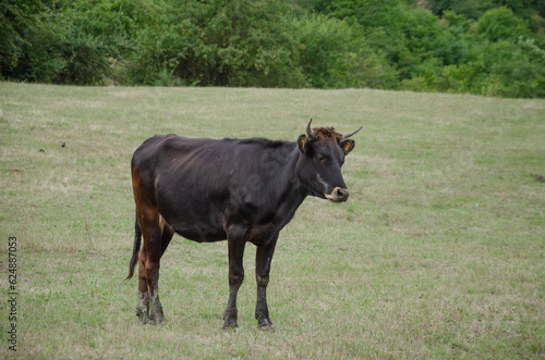 Fototapeta premium One cow walks in the summer in the pasture