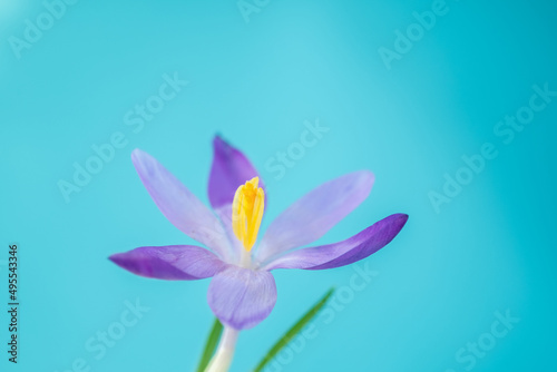 Obraz premium one crocus on a blue background. Spring concept. copy space. blur and...