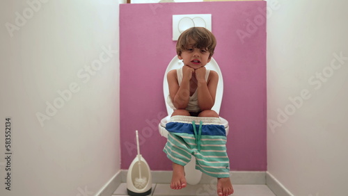 Obraz premium One cute small boy seated at toilet seat doing his needs at bathroom