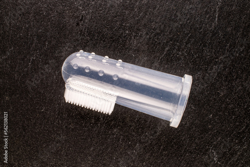 Naklejka premium One dog toothbrush, macro, on slate stone, top view.