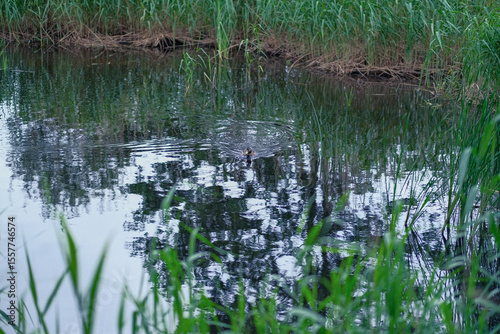 Fototapeta premium one duck swims in pond